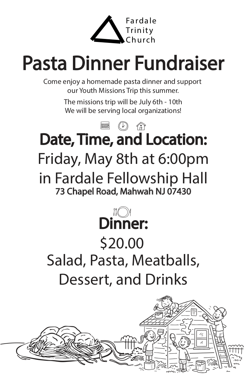 On Friday, May 8th we will have a Pasta Dinner to raise support for our Summer Youth Missions Trip. The dinner will be at 6:00 in Fellowship Hall. It costs $20 at the door.